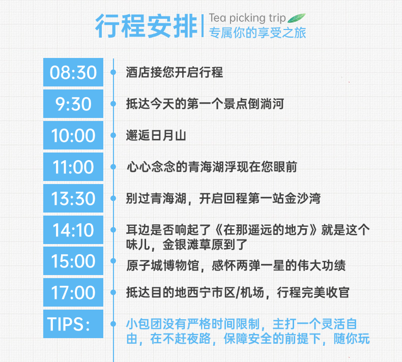 高原反应:首日避免剧烈运动,携带葡萄糖口服液。